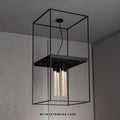 Der Caged Ceiling Chandelier 4.0 ist ein quadratischer Kronleuchter mit einem mattschwarzen Metallrahmen und einer Rückwand aus poliertem schwarzem oder weißem Marmor. Er ist mit einer strukturierten Lampenfassung und den kultigen Buster + Punch Penny-Knöpfen ausgestattet.