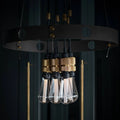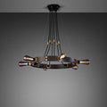 This luminaire combines contemporary industrial design with functional versatility. The 6 metal pendants can either be positioned on the ring or left hanging in the center of the ring, offering total aesthetic freedom.