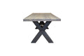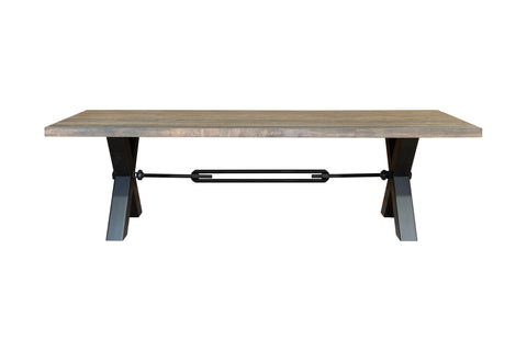 The thick, generously proportioned top is supported by an X-shaped metal frame, centrally reinforced by a decorative tie rod, adding an air of technical stability and urban-industrial style. Every detail is designed to create a functional and spectacular piece.