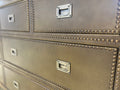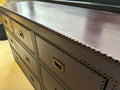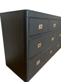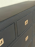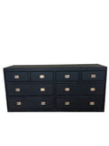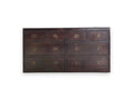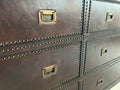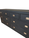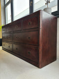 Această comodă din lemn masiv, capitonată și îmbrăcată în piele de înaltă calitate, reprezintă o piesă de mobilier care îmbină perfect rafinamentul și funcționalitatea. Cu o dimensiune de 180 cm lungime, 49 cm lățime și 82 cm înălțime, această comodă oferă un spațiu generos pentru depozitare, datorită celor 8 sertare spațioase, fiecare echipat cu mânere metalice cu un design vintage, ce conferă piesei un aer atemporal.